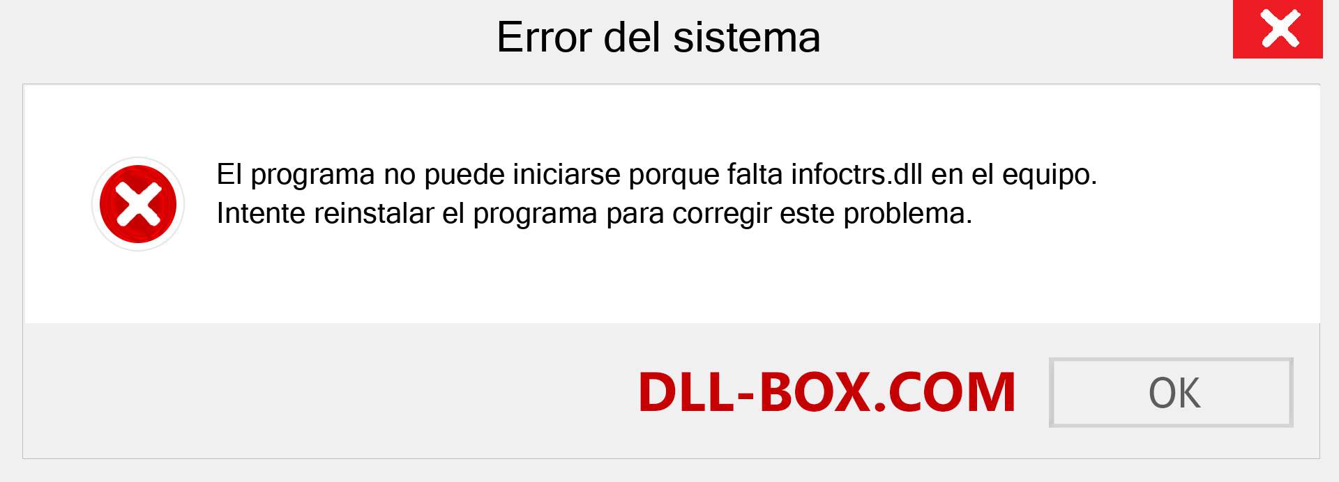 1. El programa no puede iniciarse porque falta infoctrs.dll en su computadora. Intente reinstalar el programa para solucionar este problema.